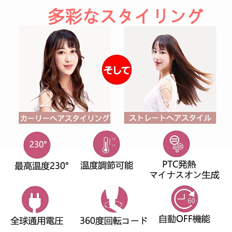 商品説明 おすすめポイント ストレート&カール両用 この最新版2waysヘアアイロン、円弧形状ヘッドなのでストレートだけでなく毛先等を完璧に仕上げられる、カール効果もまるで美容院のようになります。