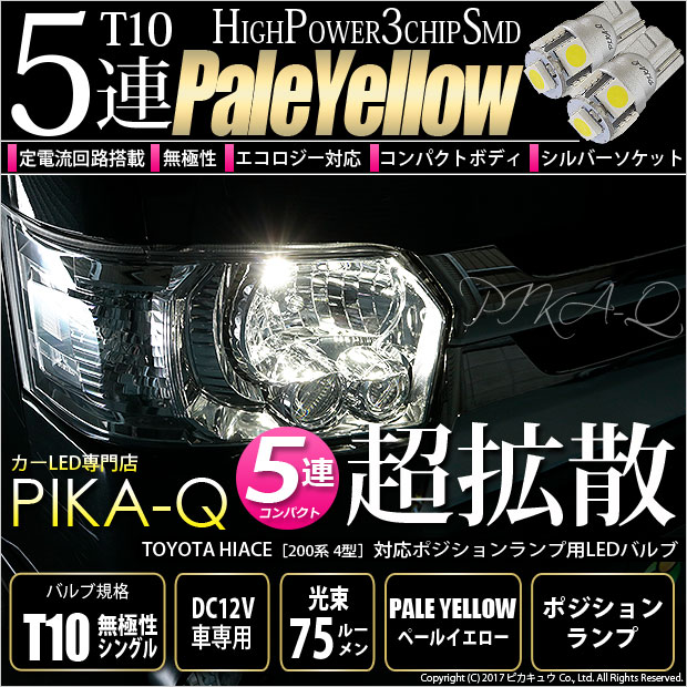 【車幅灯】トヨタ ハイエース[200系 4型]ポジションランプ対応LED T10 High Power 3chip SMD 5連ウェッジシングルLED球 LEDカラー:ペールイエロー(4300K) 無極性タイプ 1セット2個入(2-B-7)